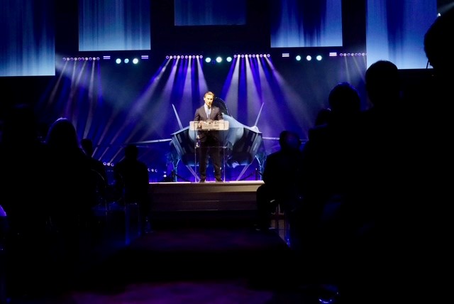 Puolustusministeri Antti Häkkänen puhui F-35-hävittäjän julkistustilaisuudessa Yhdysvalloissa Texasissa tiistaina 16.12.2025.
