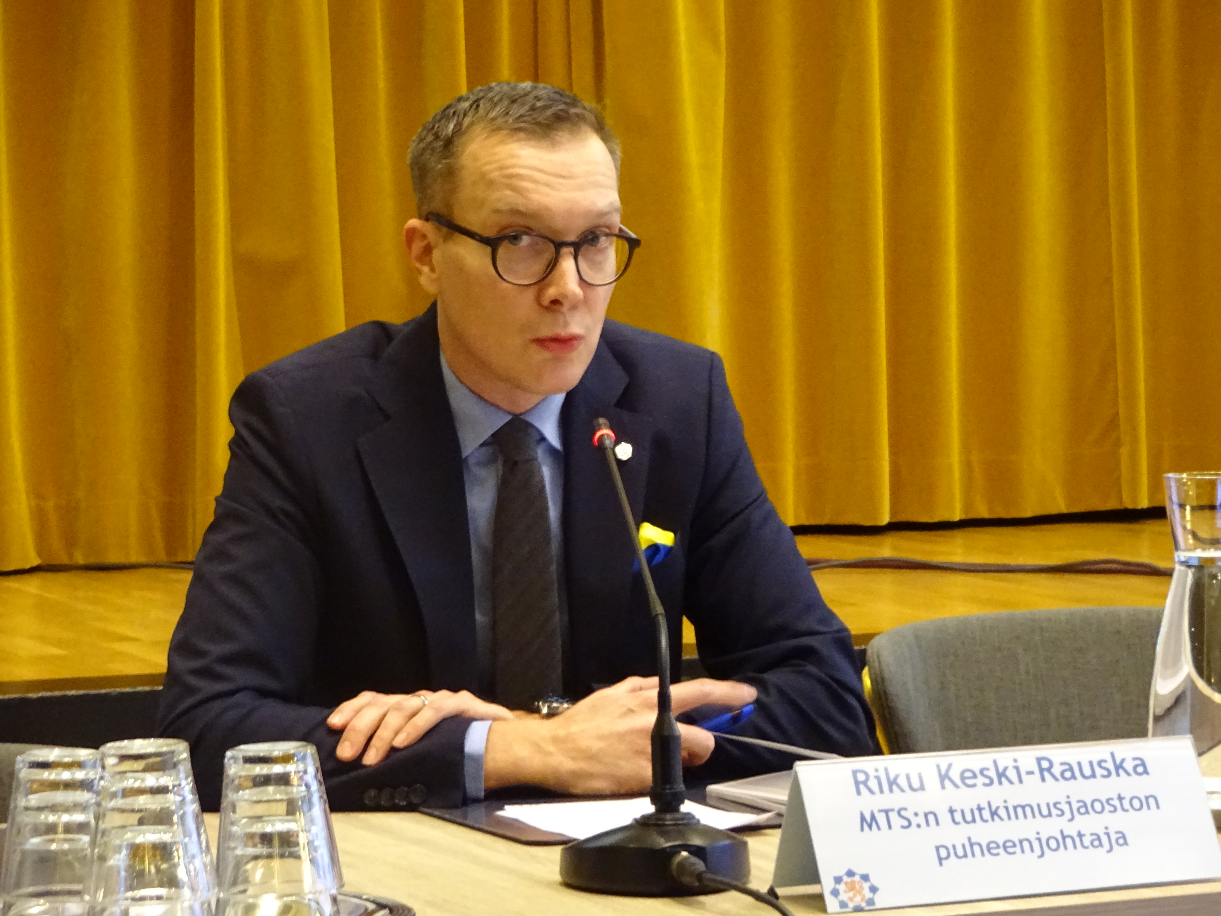 MTS:n tutkimusjaoston puheenjohtaja Riku Keski-Rauska mielipidetutkimuksen infotilaisuudessa 1.12.22 Ostrobotnian juhlasalissa. Kuva: Markus Kinkku.