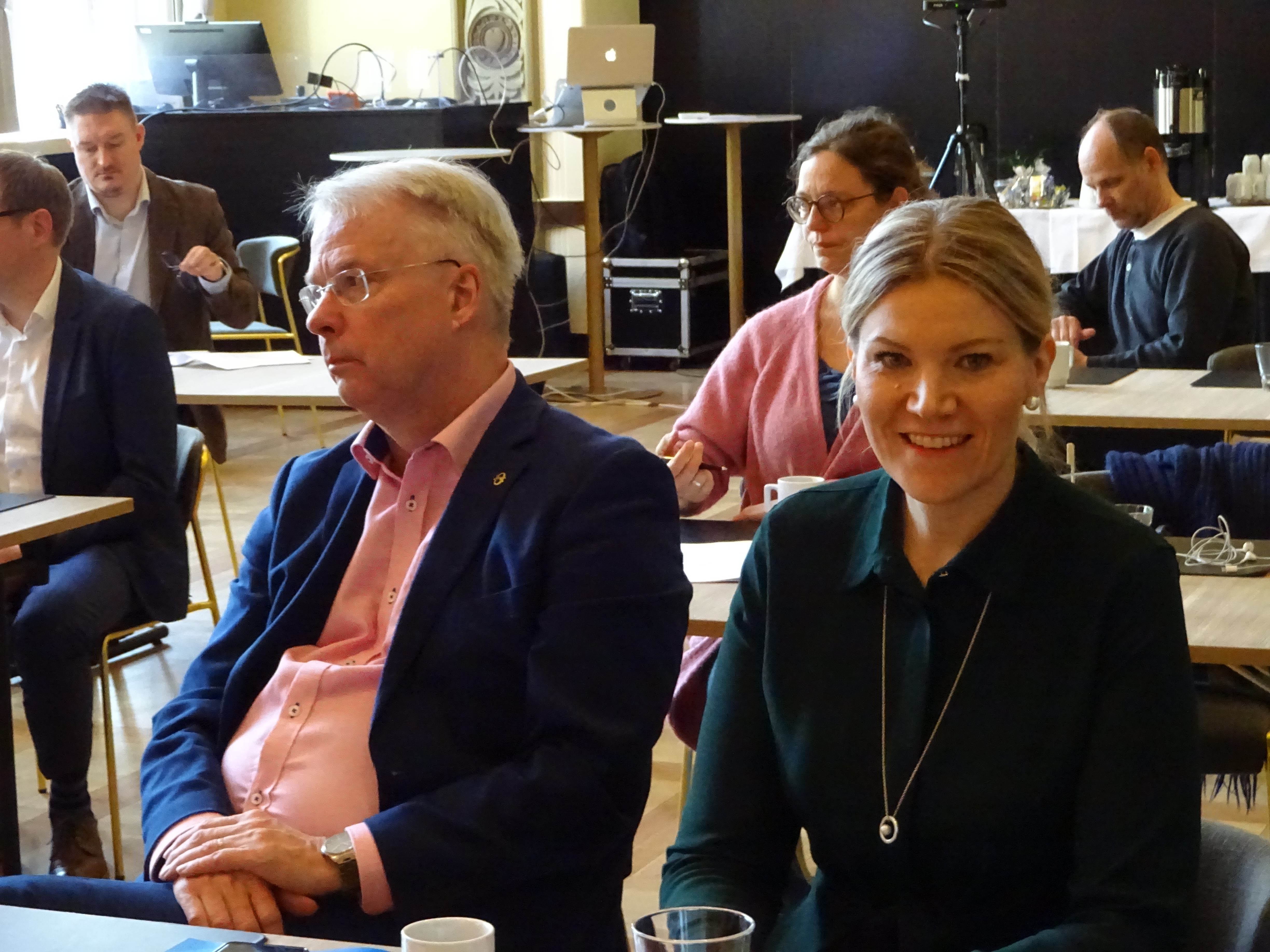 MTS:n puheenjohtaja Harri Järvinen ja MTS:n varapuheenjohtaja Sofia Vikman mielipidetutkimuksen infossa 18.5.22. Kuva: Markus Kinkku.
