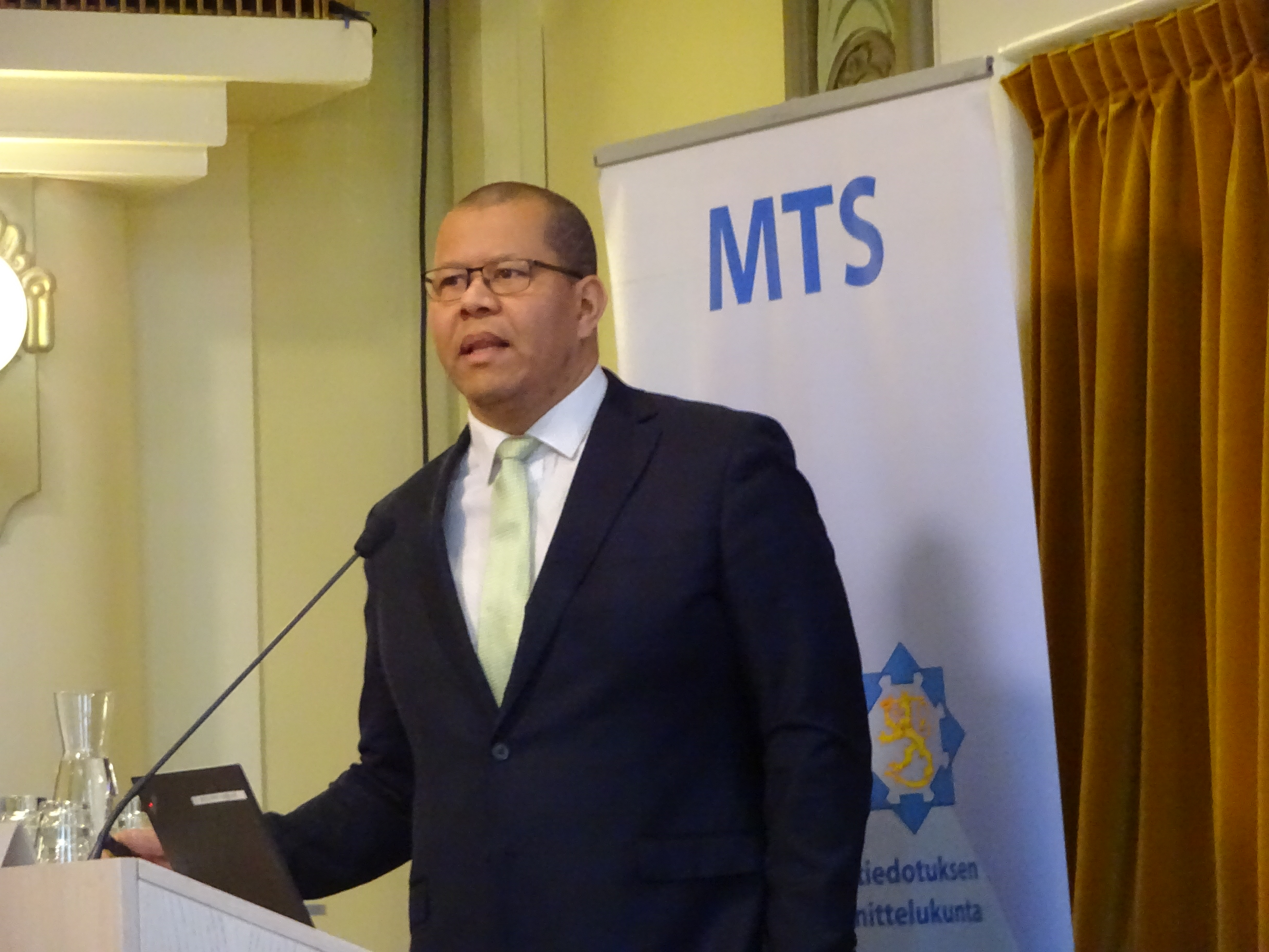 Sisäministeriön strategiapäällikkö Ari Evwaraye MTS:n journalistiseminaarissa 12.12.2023. kuva: Markus Kinkku.