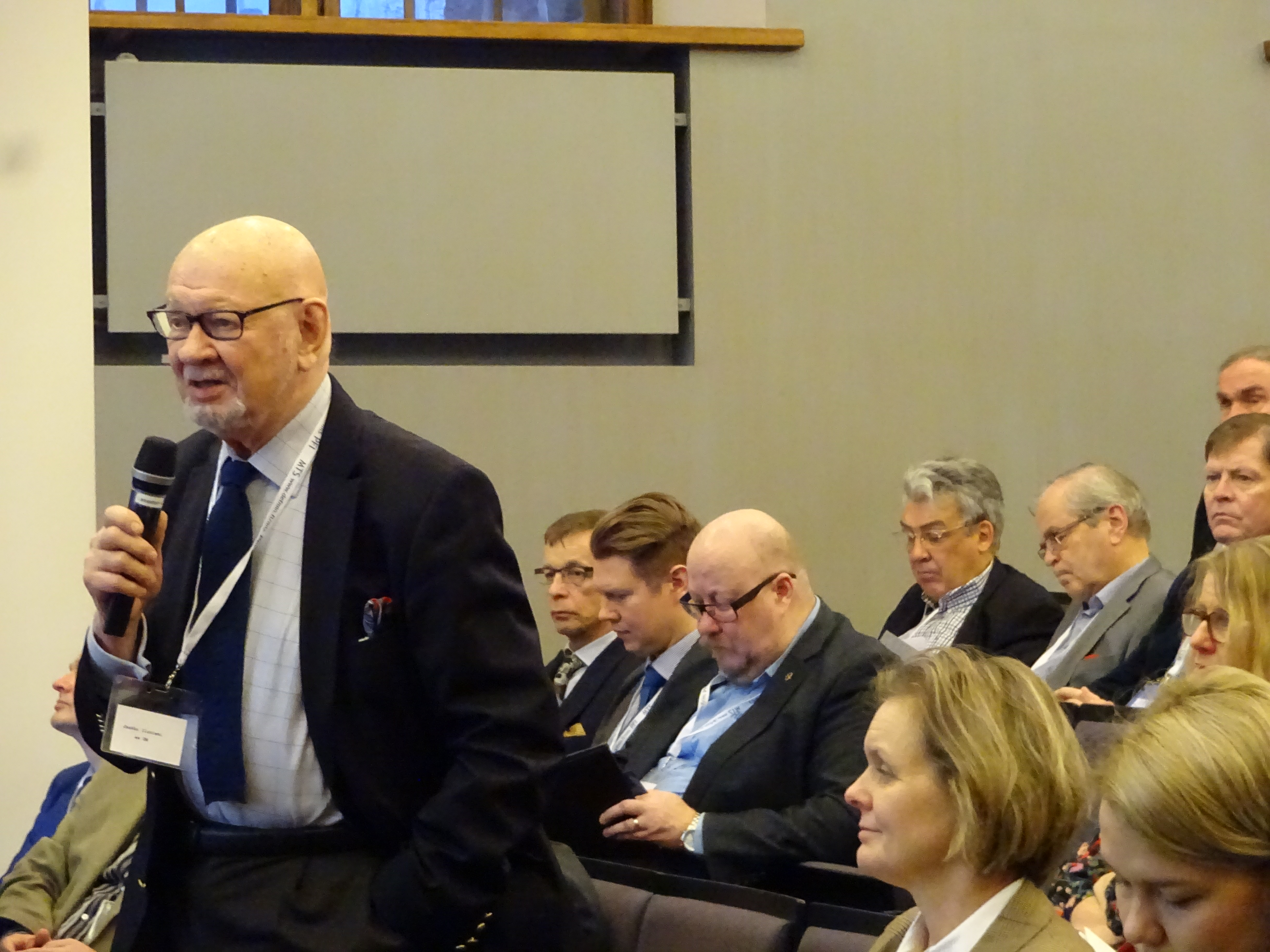 Ministeri Jaakko Iloniemi esittämässä yleisökysymystä MTS:n journalistiseminaarissa 17.12.2019 Kansallismuseossa. Kuva: Markus Kinkku.
