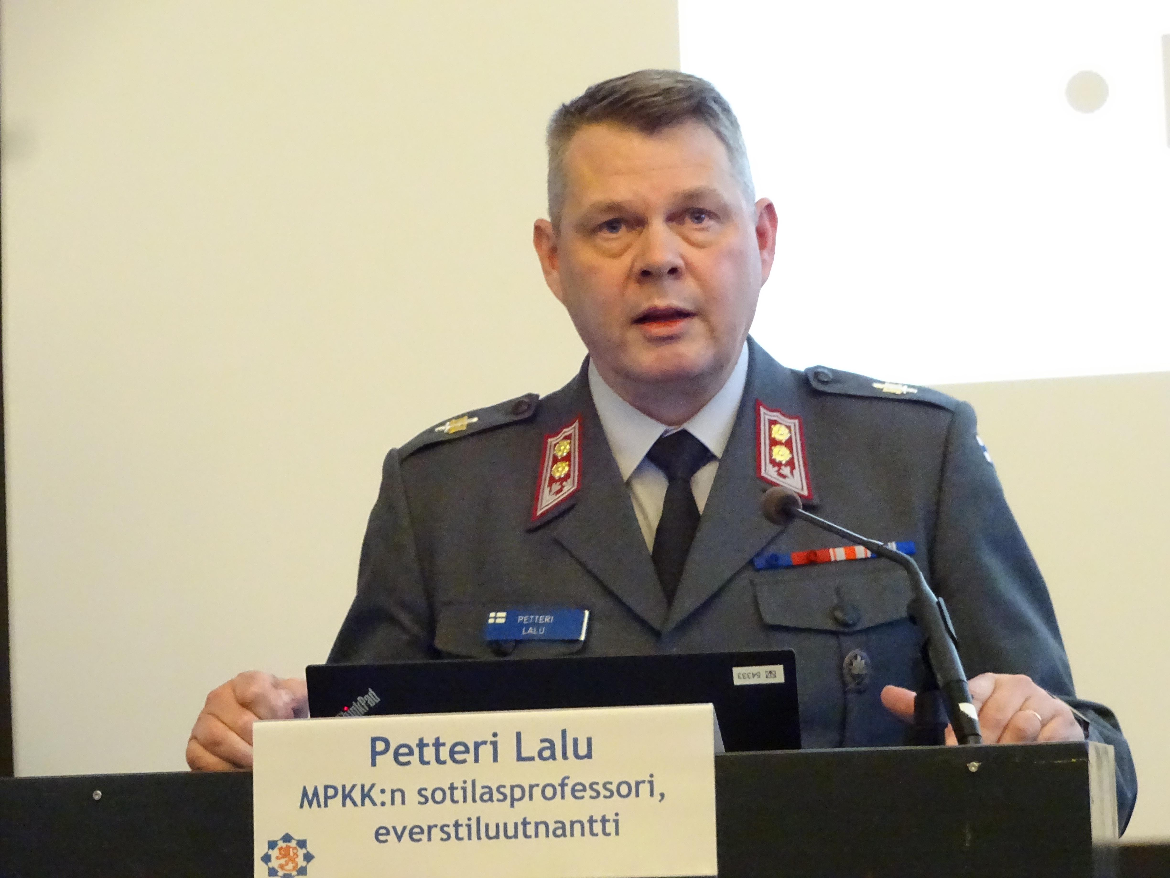 Maanpuolustuskorkeakoulun sotilasprofessori, eversiluutnantti Petteri Lalu MTS:n journalistiseminaarissa 17.12.2019. Kuva: Markus Kinkku.