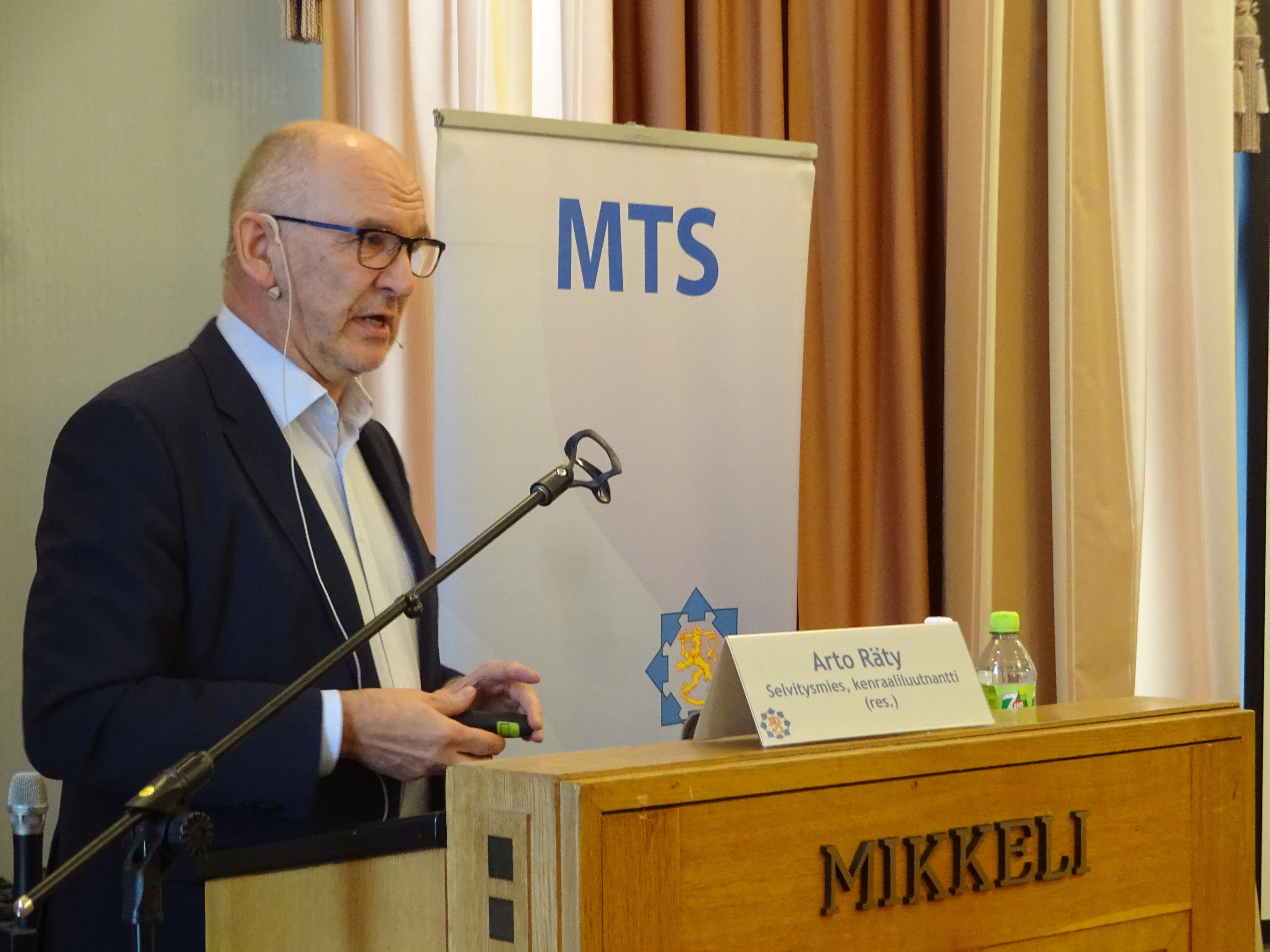 Työ- ja elinkeinoministeriön, puolustusministeriön ja ympäristöministeriön selvitysmies, kenraaliluutnantti (res.) Arto Räty MTS:n journalistiseminaarissa 6.3.2023 Mikkelissä. Kuva: Markus Kinkku.
