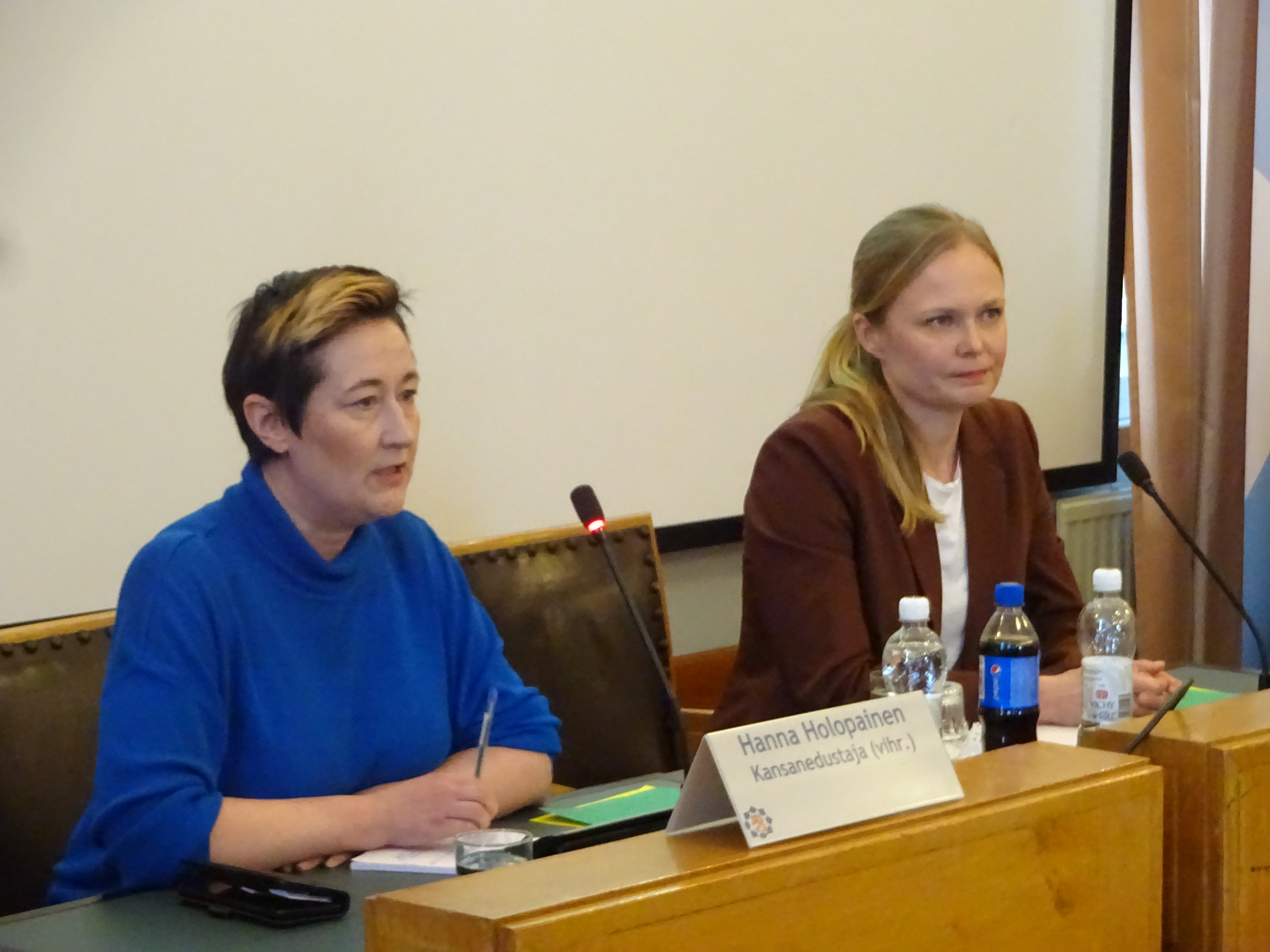 Kansanedustajat Hanna Holopainen (vihr.) ja Hanna Kosonen (kesk.) MTS:n yleisötilaisuuden paneelikeskustelussa 6.3.2023 Mikkelin valtuustosalissa. Kuva: Markus Kinkku.