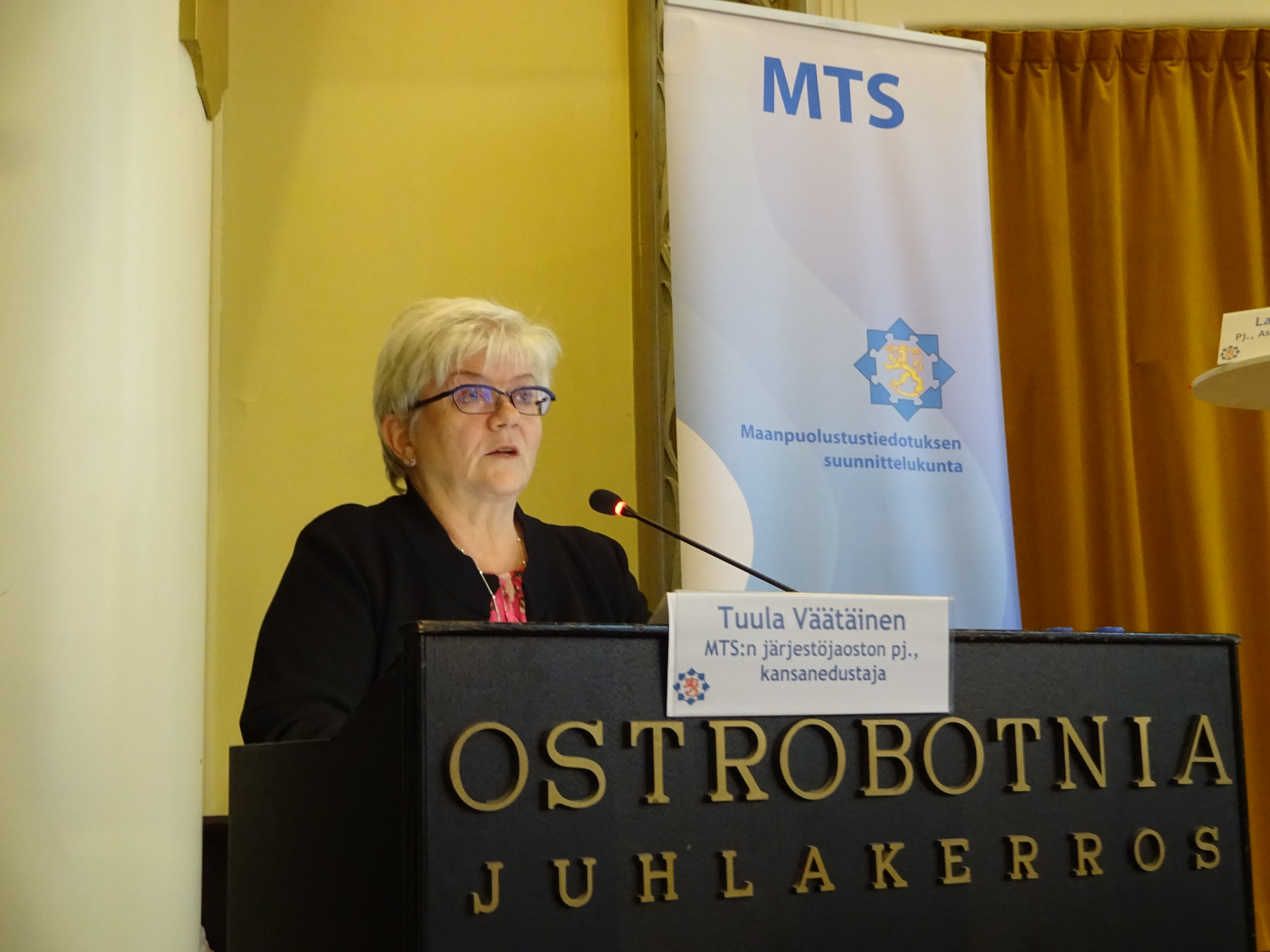 MTS:n järjestöjaoston puheenjohtaja, kansanedustaja Tuula Väätäinen lausumassa Nuorisofoorumin loppusanoja Ostrobotnialla 26.10.21. Kuva: Markus Kinkku.