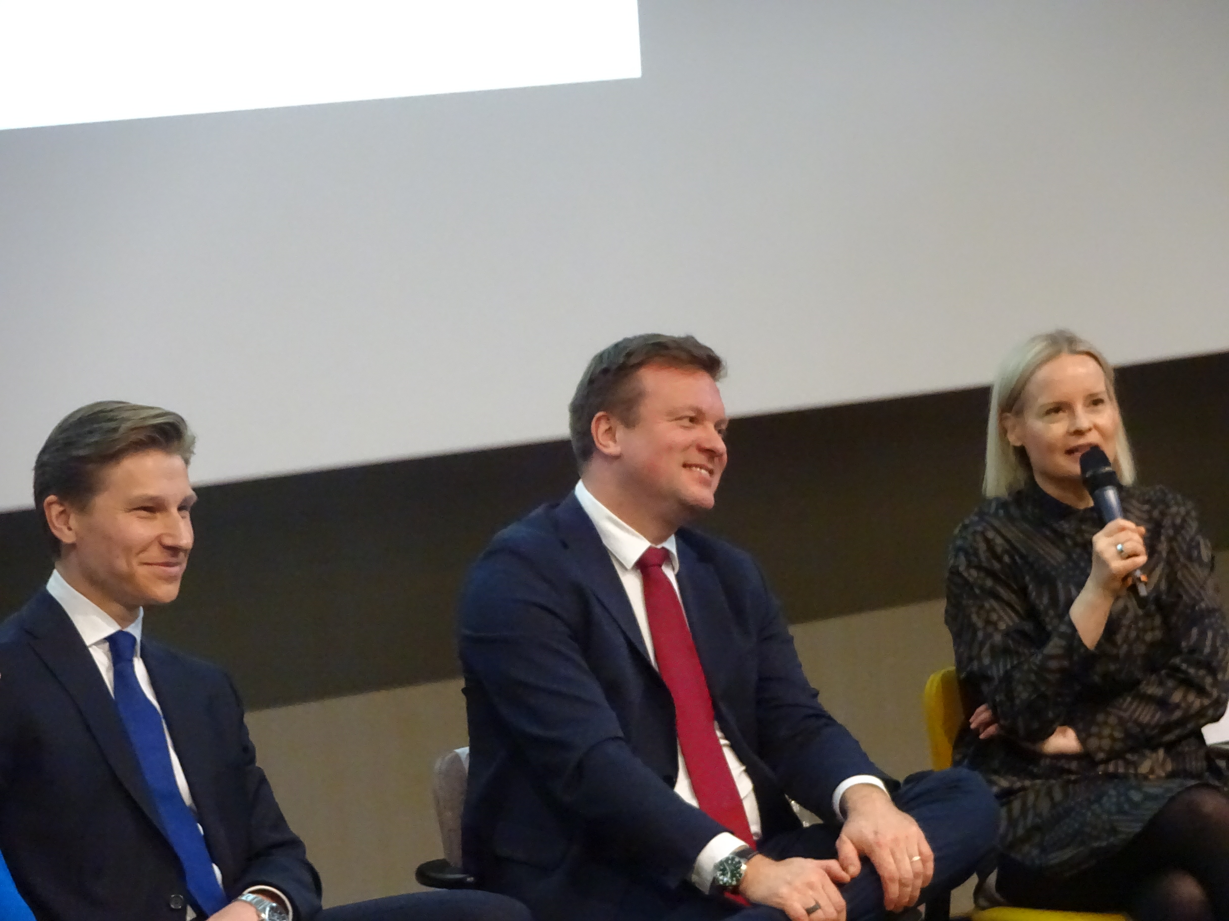 Kokoomuksen varapuheenjohtaja, puolustusvaliokunnan puheenjohtaja Antti Häkkänen, SDP:n varapuheenjohtaja, kehitysyhteistyö- ja ulkomaankauppaministeri Ville Skinnari ja Perussuomalaisten puheenjohtaja, kansanedustaja Riikka Purra MTS:n vaaliseminaarissa 28.2.2023 Kansallismuseon auditoriossa. Kuva: Markus Kinkku.