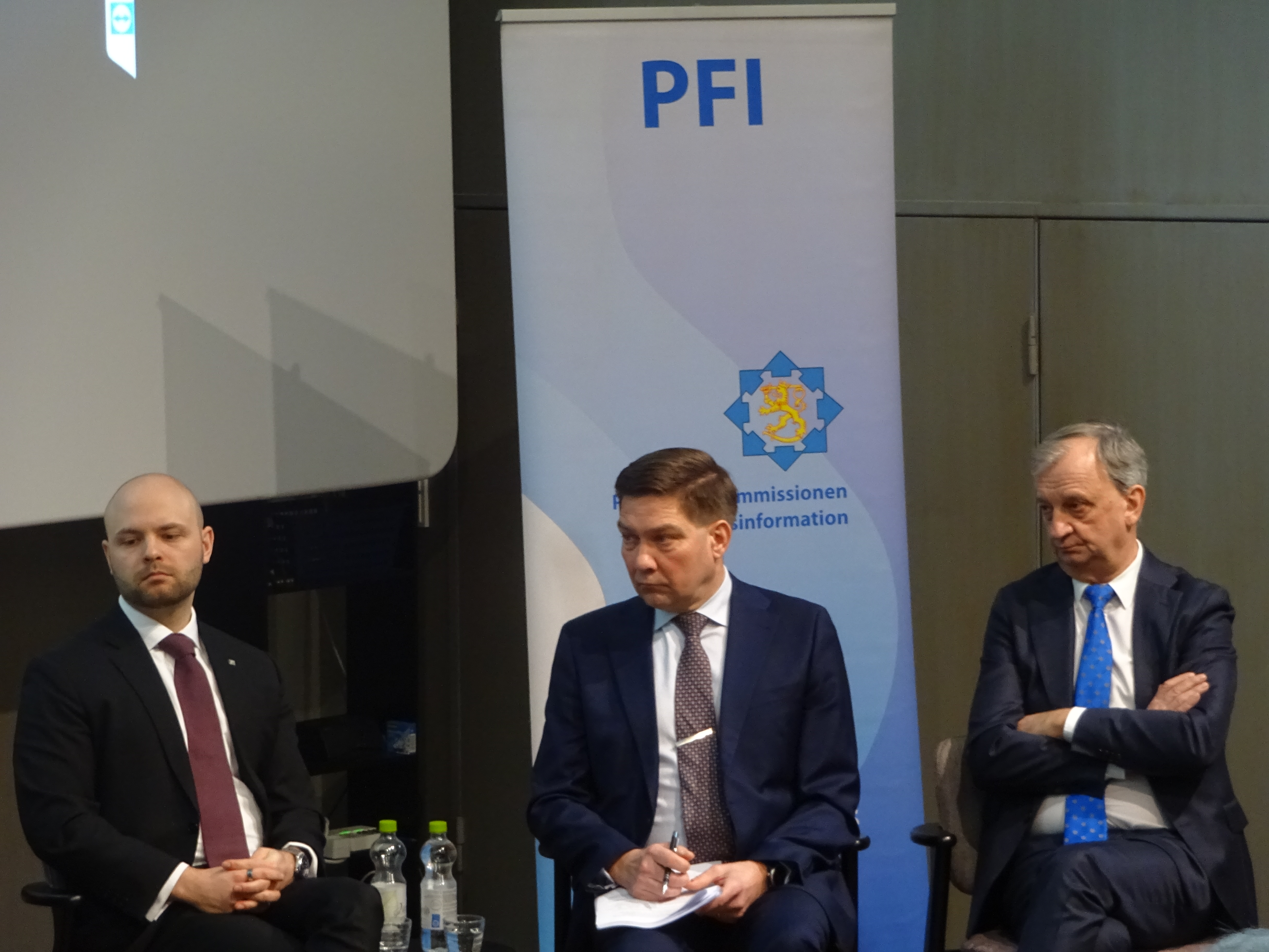 Keskustan kansanedustaja, puolustusvaliokunnan jäsen Joonas Könttä, pohjoismaisen yhteistyön ja tasa-arvon ministeri, kansanedustaja Thomas Blomqvist ja Liike Nytin puheenjohtaja, kansanedustaja Harry Harkimo 28.2.2023 MTS:n vaaliseminaarissa Kansallismuseon auditoriossa. Kuva: Markus Kinkku.